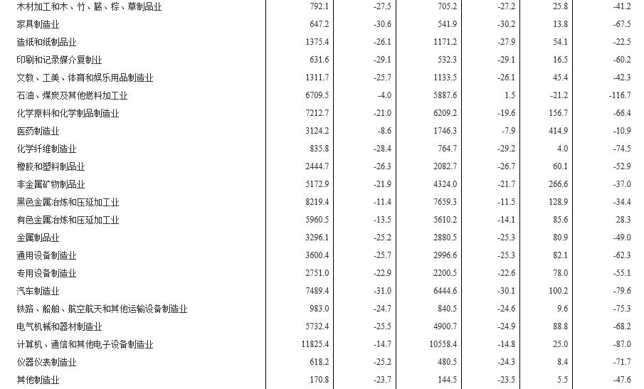 二、规模以上工业企业利润总额、营业收入等指标的增速均按可比口径计算。报告期数据与上年所公布的同指标数据之间有不可比因素,不能直接相比计算增速。其主要原因是:(一)根据统计制度,每年定期对规模以上工业企业调查范围进行调整。每年有部分企业达到规模标准纳入调查范围,也有部分企业因规模变小而退出调查范围,还有新建投产企业、破产、注(吊)销企业等变化。(二)加强统计执法,对统计执法检查中发现的不符合规模以上工业统计要求的企业进行了清理,对相关基数依规进行了修正。(三)加强数据质量管理,剔除跨地区、跨行业重复统计数据。