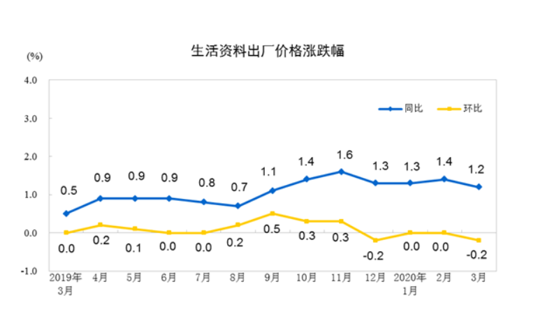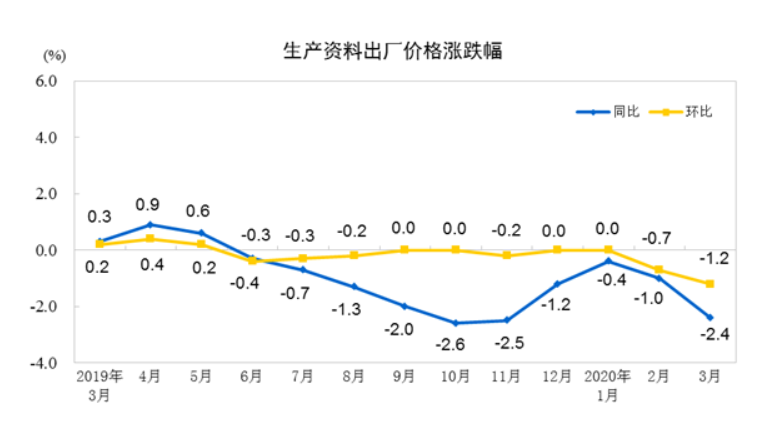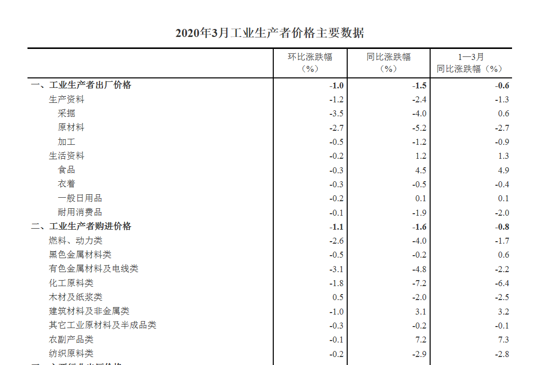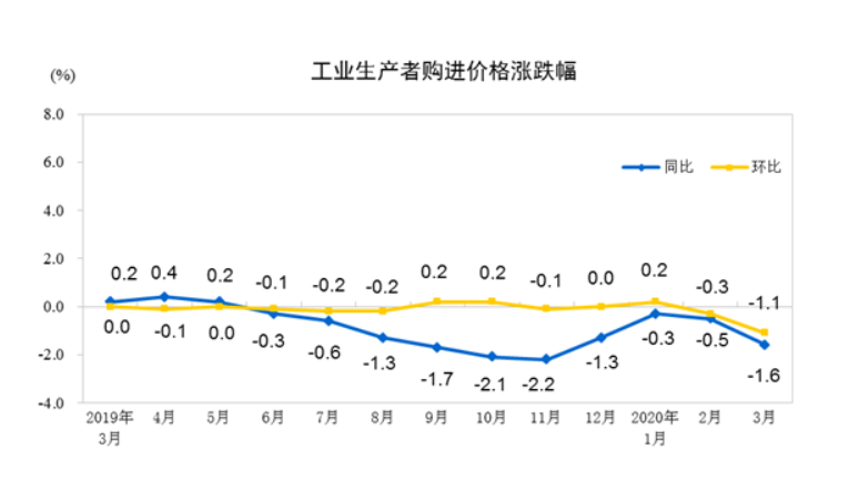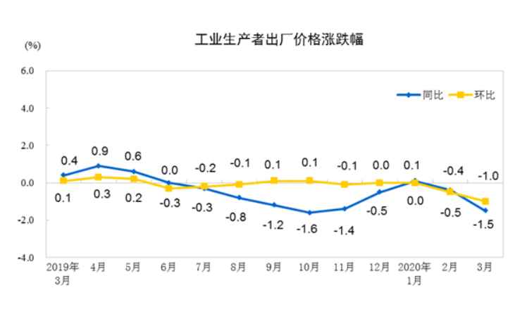 2020年3月份,全国工业生产者出厂价格同比下降1.5%,环比下降1.0%;工业生产者购进价格同比下降1.6%,环比下降1.1%。一季度,工业生产者出厂价格比去年同期下降0.6%,工业生产者购进价格下降0.8%。