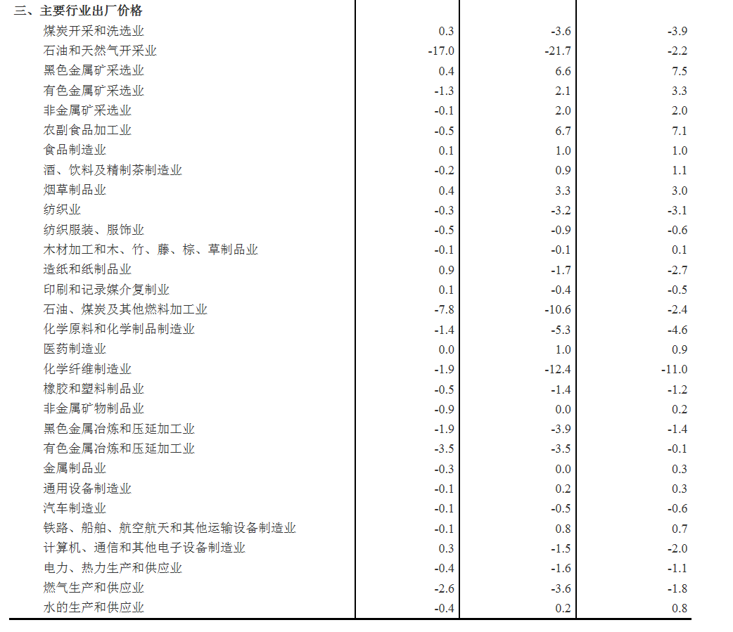 工业生产者出厂价格中,生产资料价格环比下降1.2%,降幅比上月扩大0.5个百分点,影响工业生产者出厂价格总水平下降约0.91个百分点。其中,采掘工业价格下降3.5%,原材料工业价格下降2.7%,加工工业价格下降0.5%。生活资料价格环比下降0.2%,影响工业生产者出厂价格总水平下降约0.05个百分点。其中,食品和衣着价格均下降0.3%,一般日用品价格下降0.2%,耐用消费品价格下降0.1%。