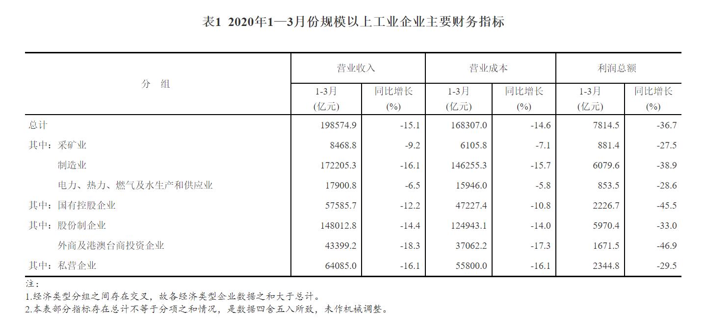 1—3月份,全国规模以上工业企业实现利润总额7814.5亿元,同比下降36.7%(按可比口径计算,详见附注二),降幅比1—2月份收窄1.6个百分点。