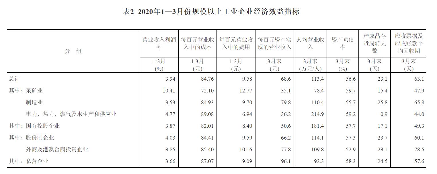 1—3月份,规模以上工业企业实现营业收入19.86万亿元,同比下降15.1%;发生营业成本16.83万亿元,下降14.6%;营业收入利润率为3.94%,同比降低1.34个百分点。