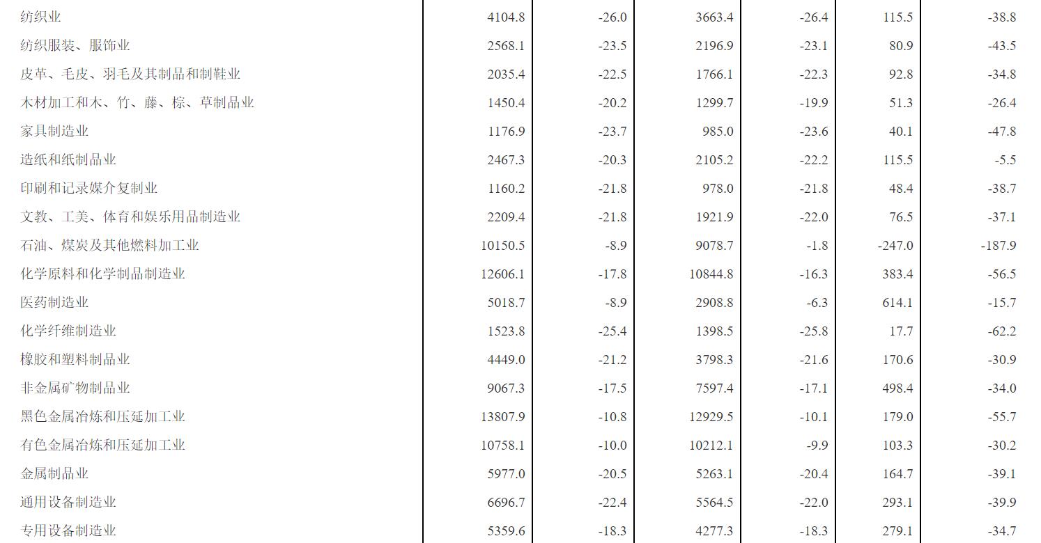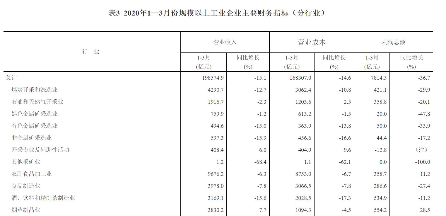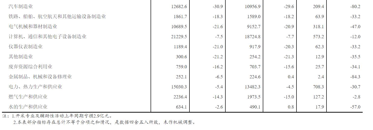 1—3月份,在41个工业大类行业中,2个行业利润总额同比增加,39个行业减少。主要行业利润情况如下:烟草制品业利润总额同比增长28.5%,农副食品加工业增长11.2%,汽车制造业下降80.2%,化学原料和化学制品制造业下降56.5%,黑色金属冶炼和压延加工业下降55.7%,电气机械和器材制造业下降47.0%,通用设备制造业下降39.9%,纺织业下降38.8%,专用设备制造业下降34.7%,非金属矿物制品业下降34.0%,电力、热力生产和供应业下降30.7%,有色金属冶炼和压延加工业下降30.2%,煤炭开采和洗选业下降29.9%,石油和天然气开采业下降20.1%,计算机、通信和其他电子设备制造业下降12.0%,石油、煤炭及其他燃料加工业由上年同期盈利转为亏损。