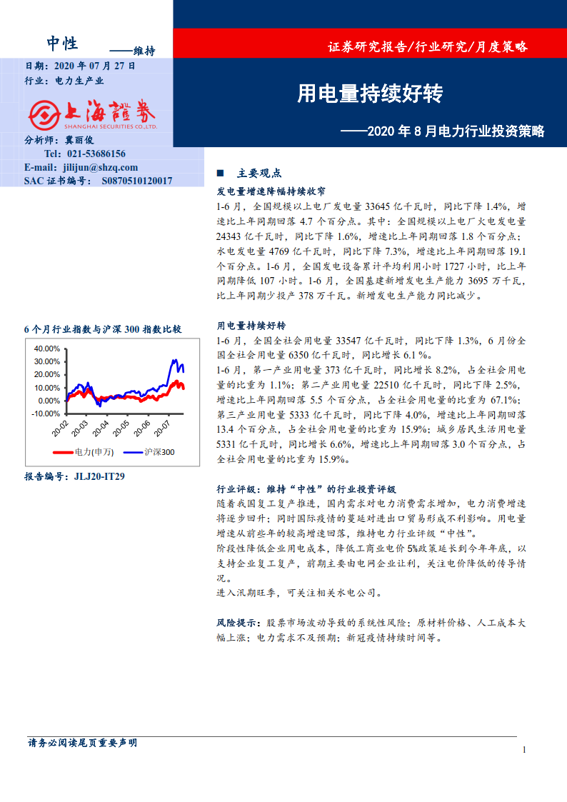 随着我国复工复产推进,国内需求对电力消费需求增加,电力消费增速将逐步回升;同时国际疫情的蔓延对进出口贸易形成不利影响。用电量增速从前些年的较高增速回落,维持电力行业评级“中性”。