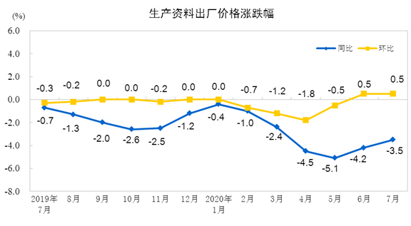 2020年7月份,全国工业生产者出厂价格同比下降2.4%,环比上涨0.4%;工业生产者购进价格同比下降3.3%,环比上涨0.9%。1―7月平均,工业生产者出厂价格比去年同期下降2.0%,工业生产者购进价格下降2.7%。