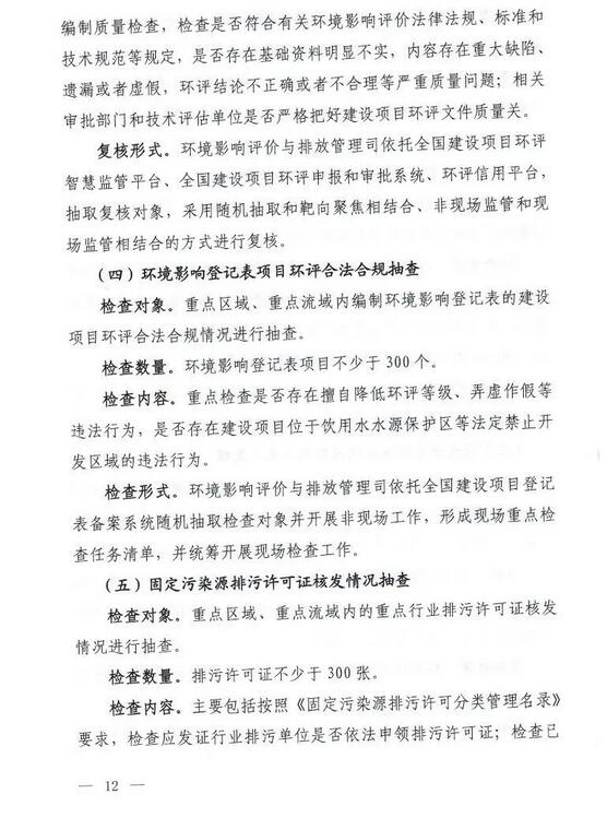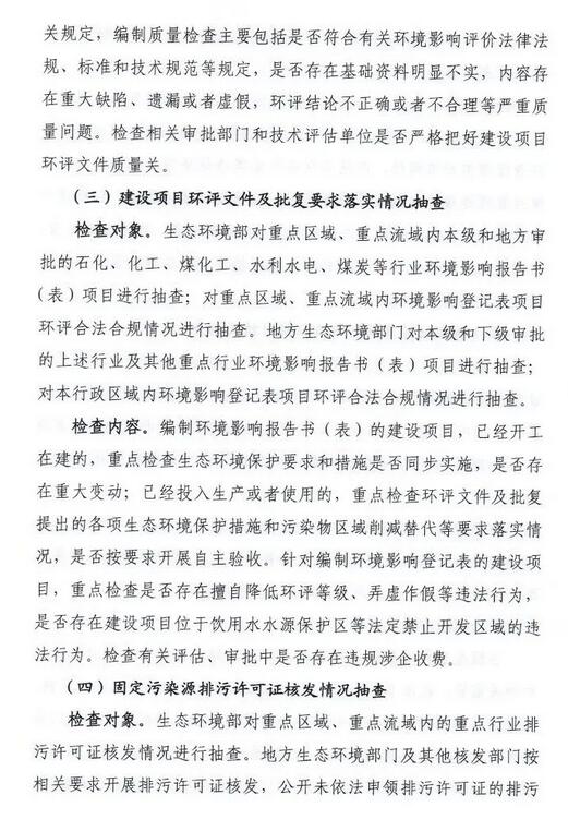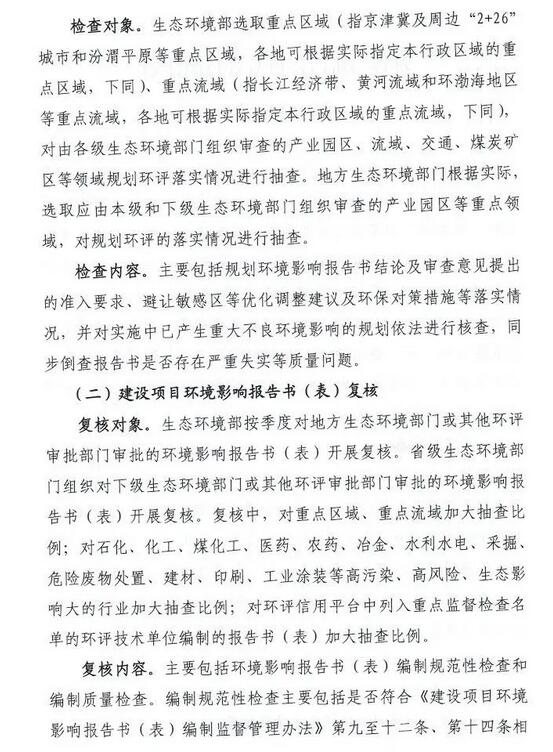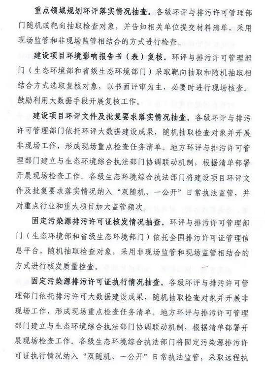 《行动计划》强调,各级生态环境部门要围绕“质量”和“落实”两个方面开展监管。针对建设项目环评,开展环评文件复核、环评文件及批复要求落实情况抽查,开展环境影响登记表项目环评合法合规情况抽查;针对规划环评,开展重点领域规划环境影响报告书落实情况抽查;针对排污许可,开展排污许可证核发、登记情况和执行情况抽查。