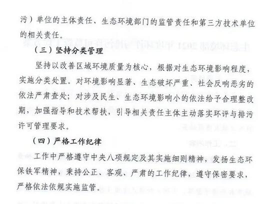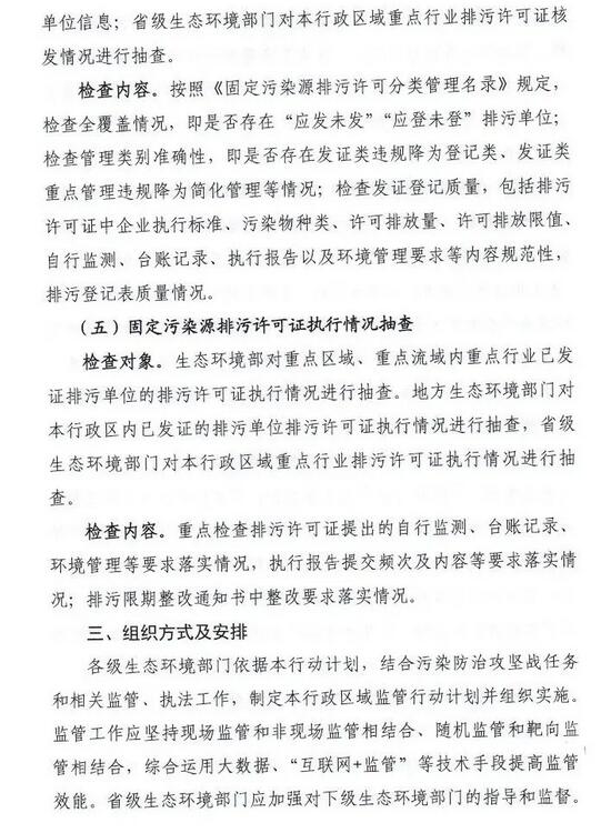 《行动计划》指出,各级生态环境部门在监管工作中应坚持以改善区域环境质量为核心,随机监管和靶向监管相结合,根据对生态环境影响程度,实施分类处置。环评与排污许可管理部门和生态环境综合执法部门应协调联动,推进审查审批与行政执法衔接,形成监管合力。