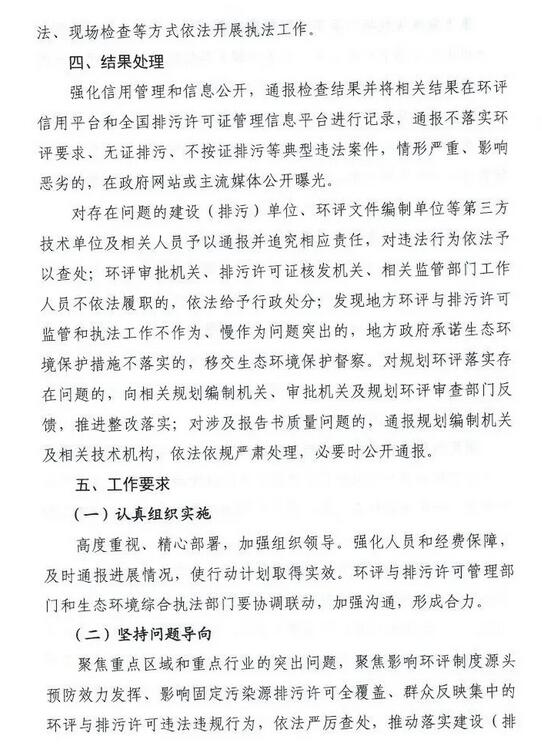 《行动计划》要求,各级生态环境部门在监管工作中应强化信用管理和信息公开,及时通报不落实环评要求、无证排污、不按证排污等典型违法案件,情形严重、影响恶劣的,在政府网站或主流媒体公开曝光。对存在问题的相关单位和人员,依法依规依纪严肃查处。