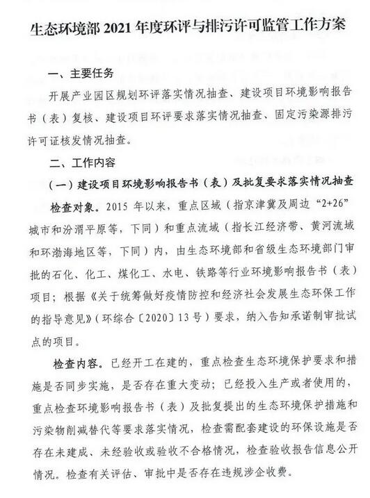《生态环境部2021年度环评与排污许可监管工作方案》同步发布,明确了生态环境部的年度重点监管工作。
