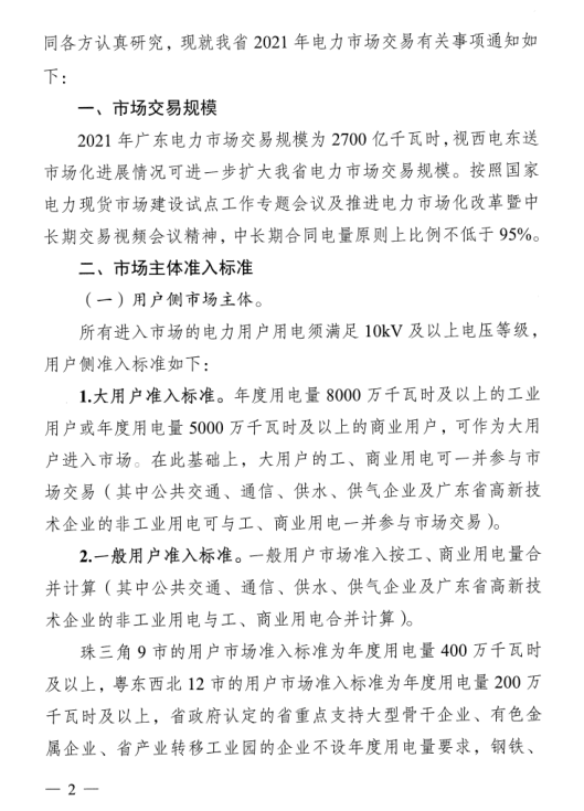 2700亿千瓦时!广东敲定2021年电力市场交易规模 用户准入门槛不变