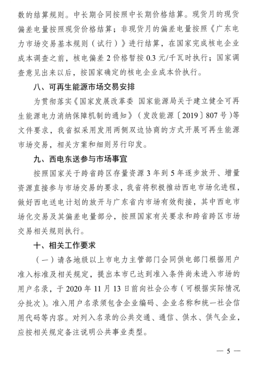 5、其他:请各地级市及以上市电力交易主管部门会同供电部门根据用户准入标准及相关规定,提成本市已达准入条件尚未进入市场的名录,于2020年11月13日前向社会公布。