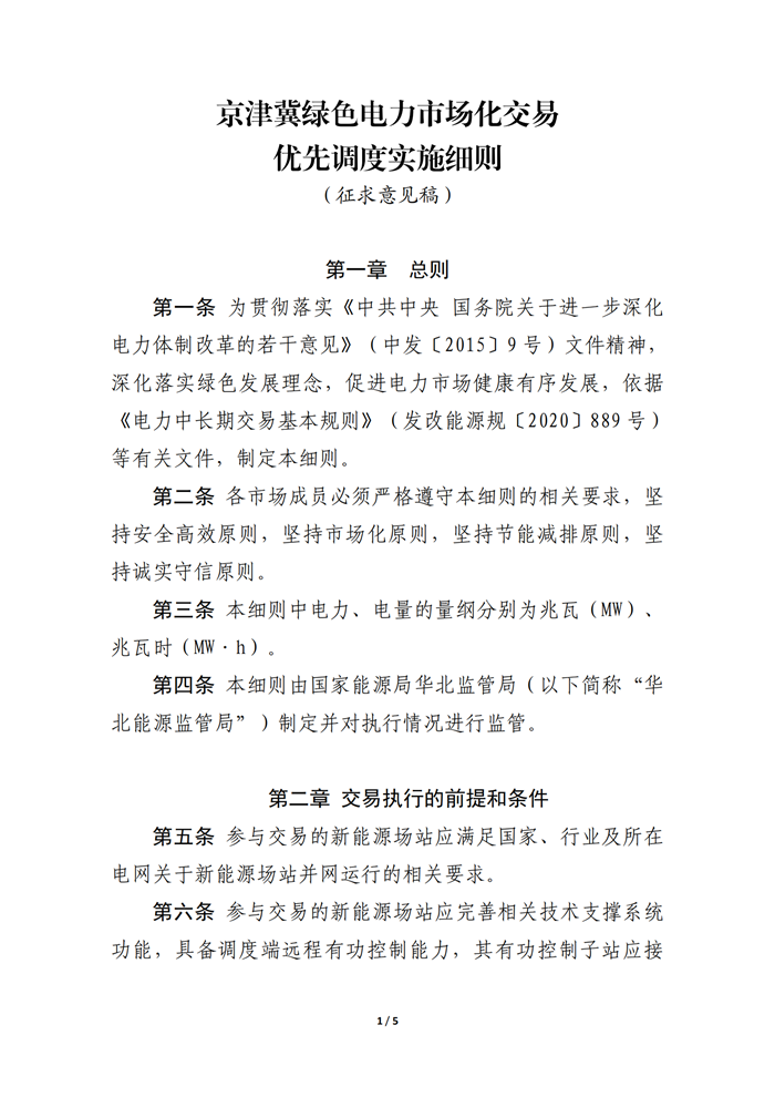 日前华北能监局发布《关于公开征求京津冀绿色电力市场化交易规则和京津冀绿色电力市场化交易优先调度实施细则意见》。