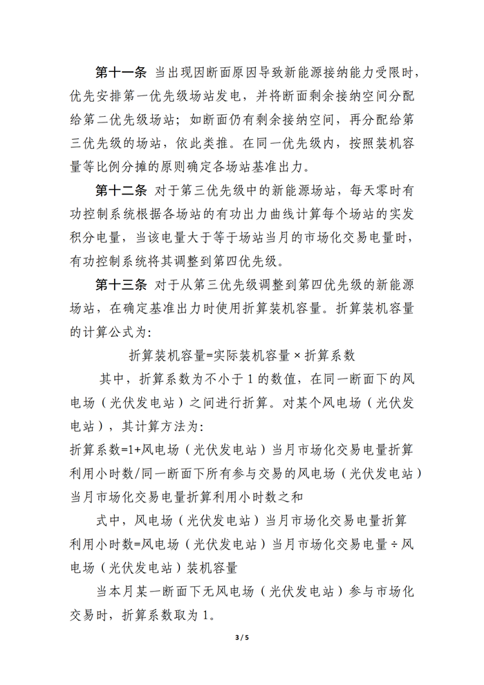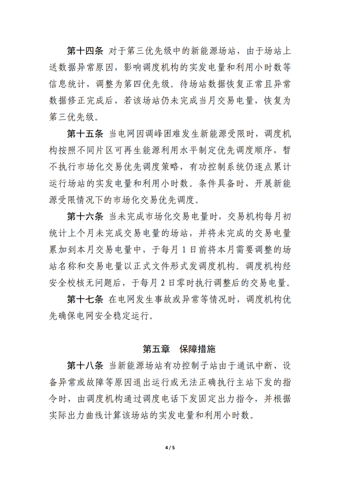 从每月 1 日零时起,调度机构逐日统计各新能源场站的实发电量和利用小时数,并在有功控制调度主站中设定不同类型场站的发电优先级:第一优先级为光伏扶贫电站, 第二优先级为特许权风电场,第三优先级为参与交易的新能 源场站,第四优先级为其他所有未参与交易的风电场和普通光伏电站。