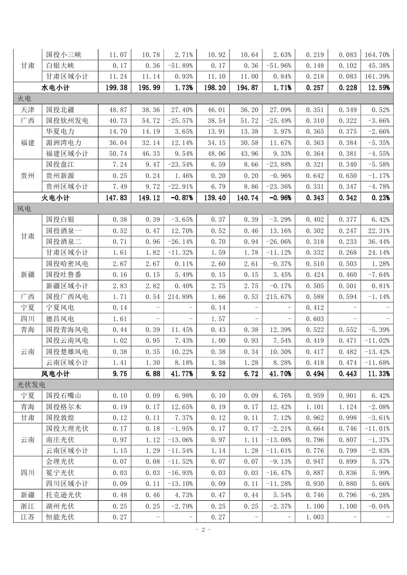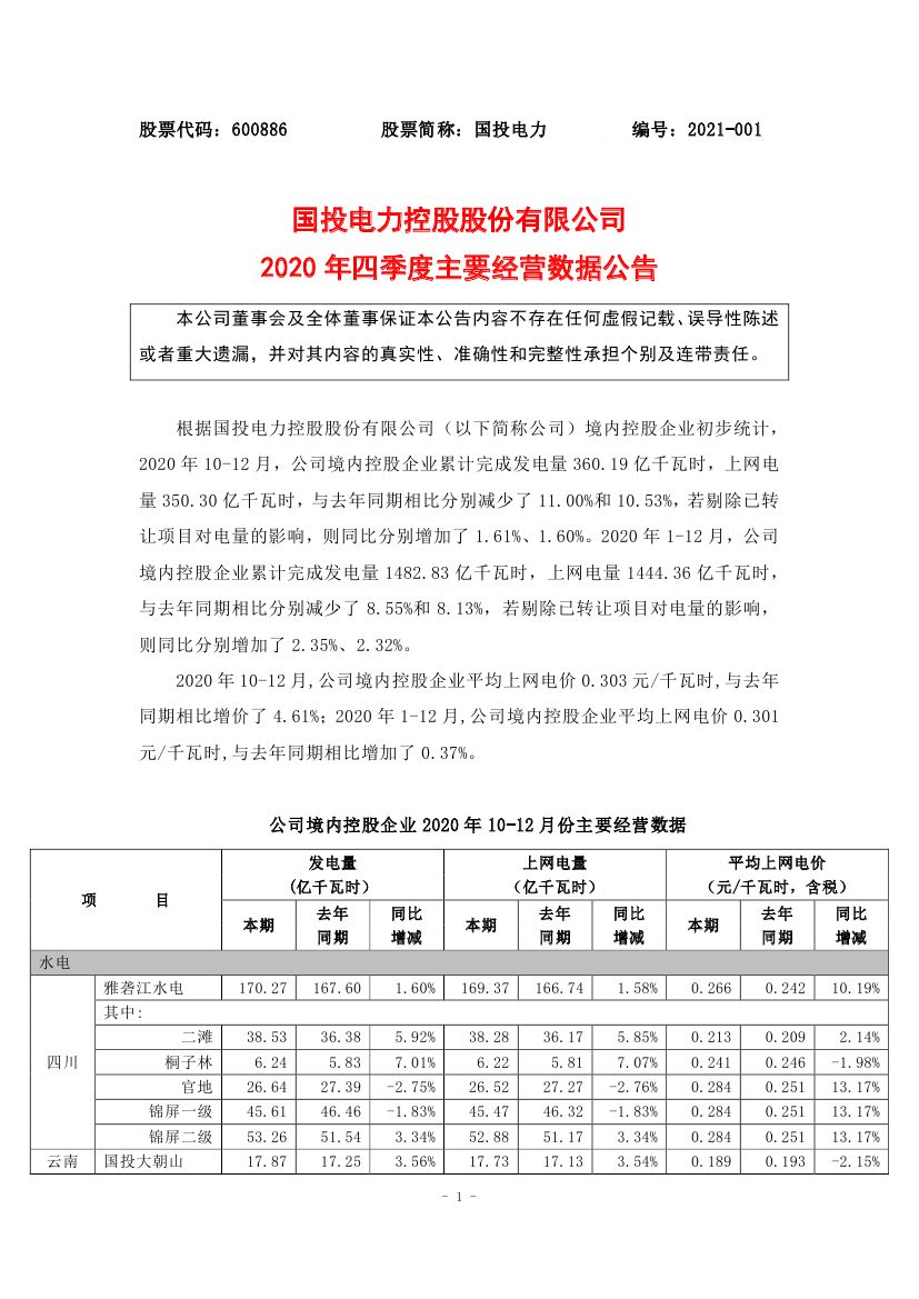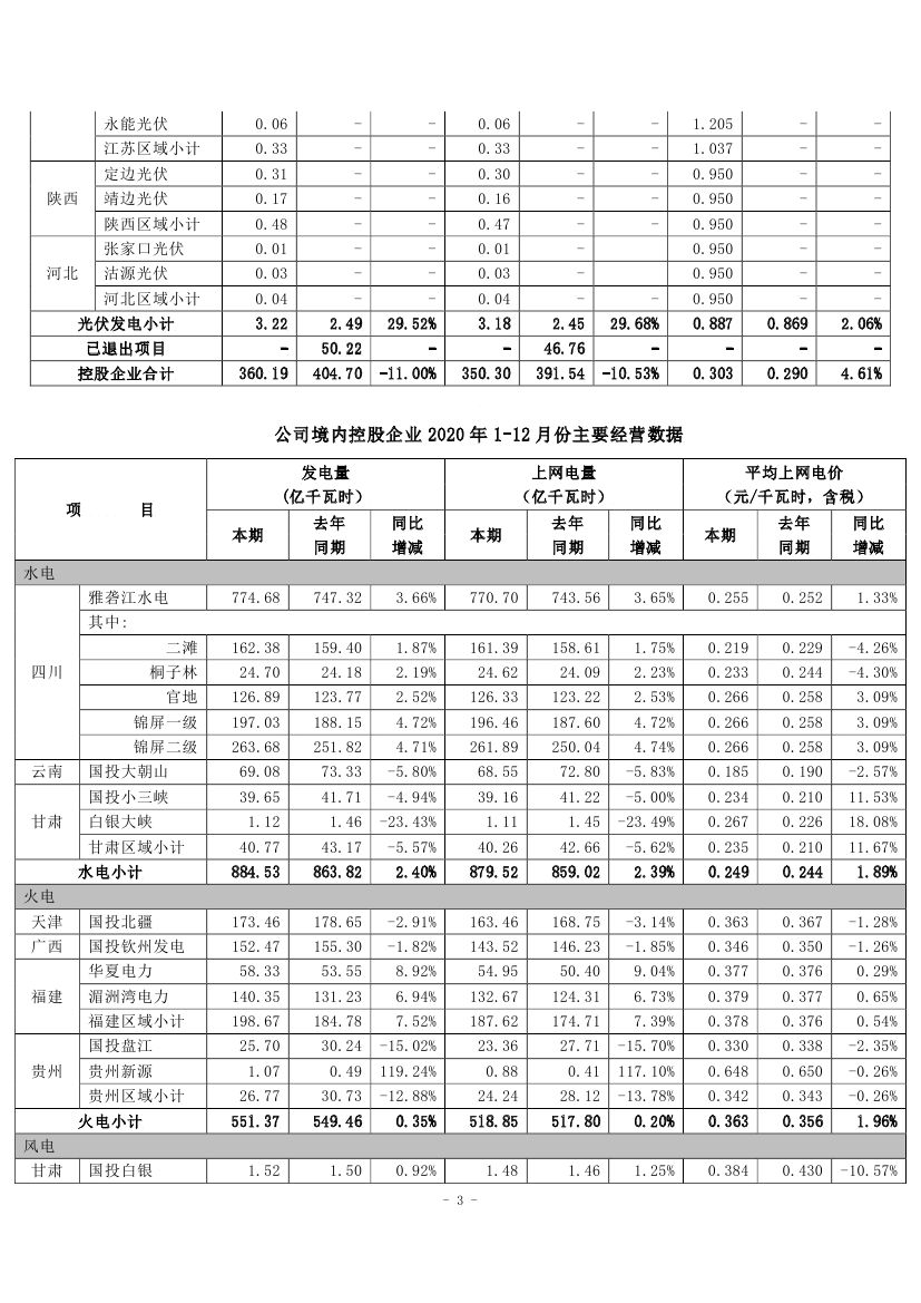 根据国投电力控股股份有限公司(以下简称公司)境内控股企业初步统计,2020年10-12月,公司境内控股企业累计完成发电量360.19亿千瓦时,上网电量350.30亿千瓦时,与去年同期相比分别减少了11.00%和10.53%,若剔除已转让项目对电量的影响,则同比分别增加了1.61%、1.60%。2020年1-12月,公司境内控股企业累计完成发电量1482.83亿千瓦时,上网电量1444.36亿千瓦时,与去年同期相比分别减少了8.55%和8.13%,若剔除已转让项目对电量的影响,则同比分别增加了2.35%、2.32%。
