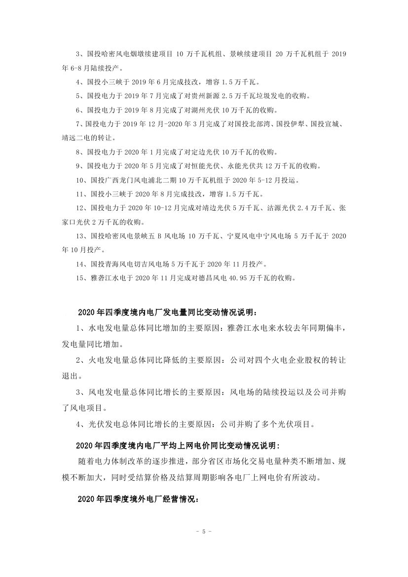 2020年10-12月,公司境内控股企业平均上网电价0.303元/千瓦时,与去年同期相比增价了4.61%;2020年1-12月,公司境内控股企业平均上网电价0.301元/千瓦时,与去年同期相比增加了0.37%。