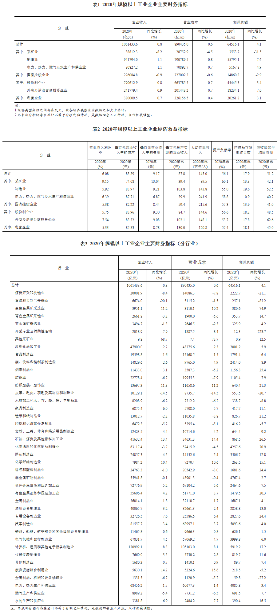 二、规模以上工业企业利润总额、营业收入等指标的增速均按可比口径计算。报告期数据与上年所公布的同指标数据之间有不可比因素,不能直接相比计算增速。其主要原因是:(一)根据统计制度,每年定期对规模以上工业企业调查范围进行调整。每年有部分企业达到规模标准纳入调查范围,也有部分企业因规模变小而退出调查范围,还有新建投产企业、破产、注(吊)销企业等变化。(二)加强统计执法,对统计执法检查中发现的不符合规模以上工业统计要求的企业进行了清理,对相关基数依规进行了修正。(三)加强数据质量管理,剔除跨地区、跨行业重复统计数据。