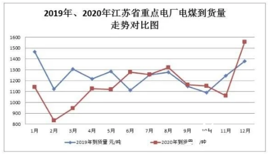 电煤到货量受季节因素影响明显:1、2月份,由于全社会和工业用电量减少,电厂发电量相应减少,全省电煤到货量大幅降低。3月份起,随着企业陆续复工复产,全省经济运行逐月向好,用电量也持续增加,随后夏季用煤旺季来临,电厂采购积极性较高,电煤到货量逐月增加。9月份之后,随着高温天气的结束全省用电负荷下降,电煤到货量明显减少。直至12月份,随着冬季供暖季的到来,电煤到货量迅速上升,达到全年最高水平。据对全省48家重点电厂监测数据显示,2020年电煤总到货量为13957.63万吨,同比减少6.3%,12月份电煤到货量为1557.62万吨,比2月份(到货量年内最低)增加86.6%,同比增加13.0%。