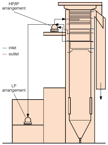 传统设计的二次再热机组(图2 ),主蒸汽和两次再热蒸汽管道在锅炉与汽轮机房之间多次来回。对于大型机组,锅炉越来越高,单根蒸汽管道的平均长度就达200m。其存在问题是: