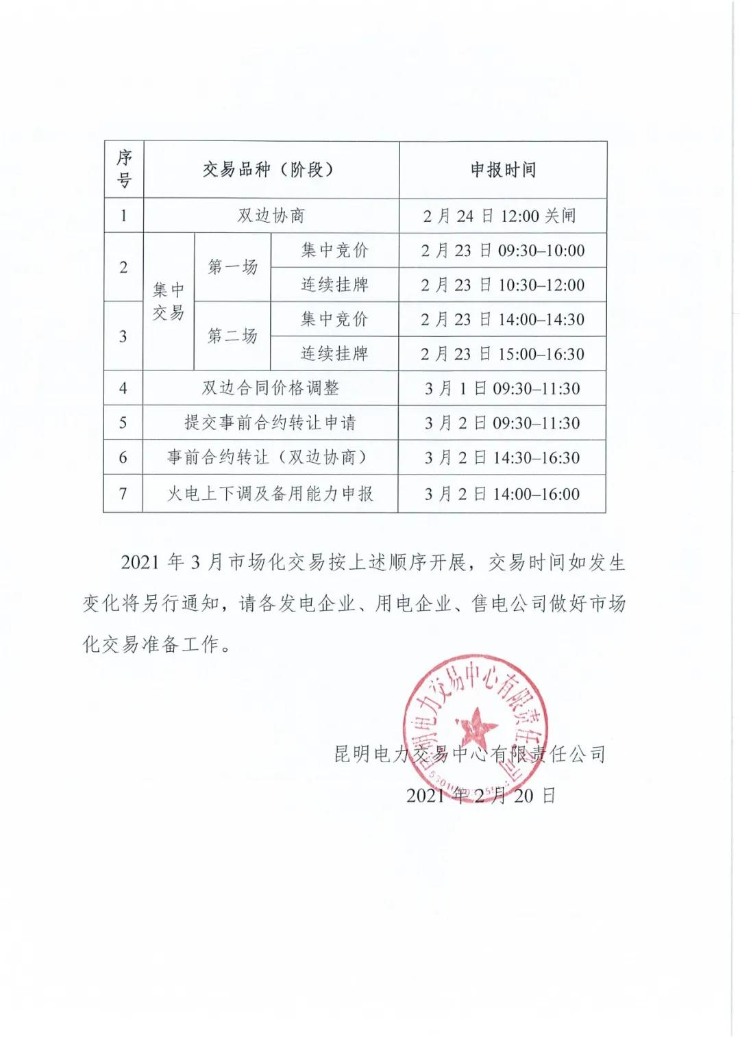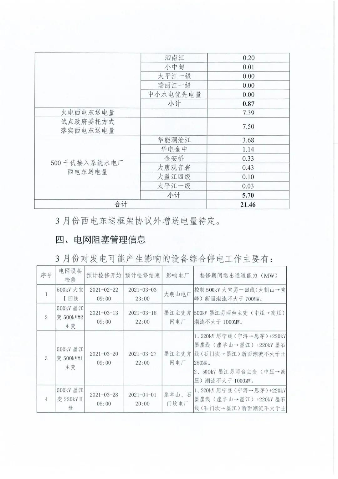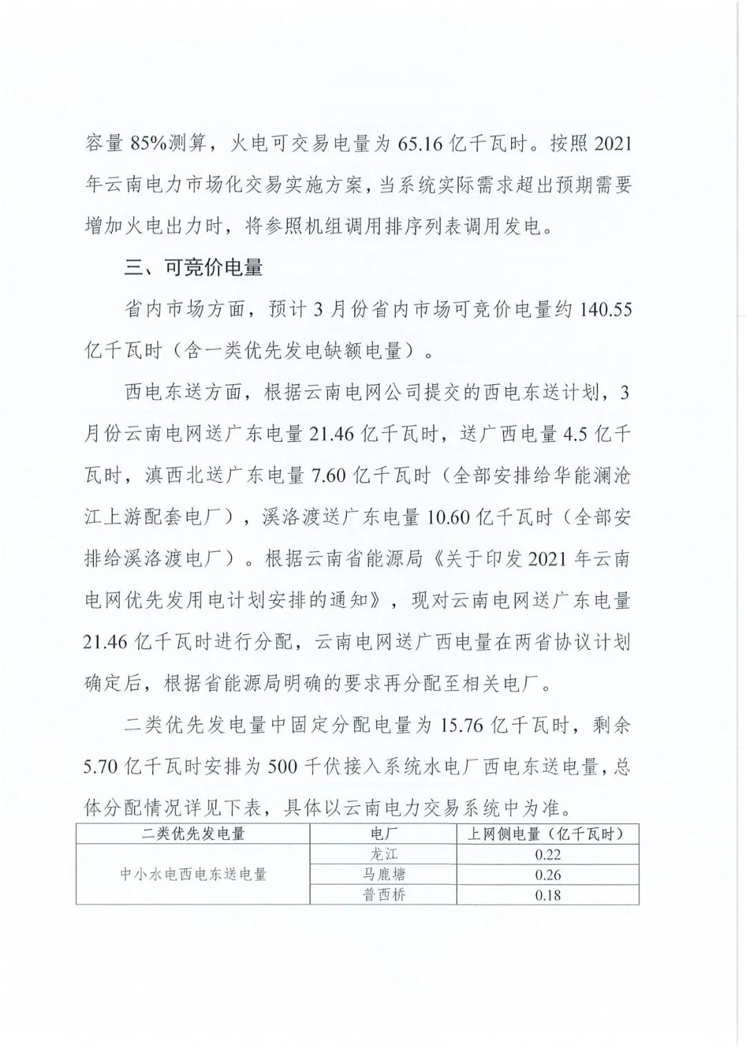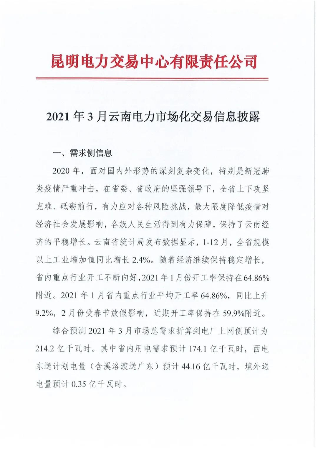 2021年3月云南电力市场化交易信息披露