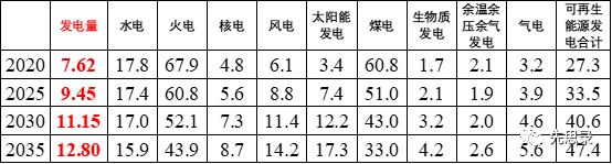 表4.2025、2030和2035年我国各类电源发电量结构预测(万亿千瓦时、%)