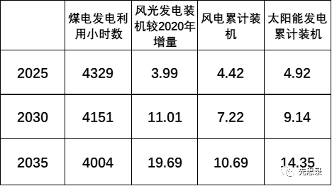 表5.2025、2030和2035年煤电发电利用小时数和风电、光伏装机的预测(小时、亿千瓦)