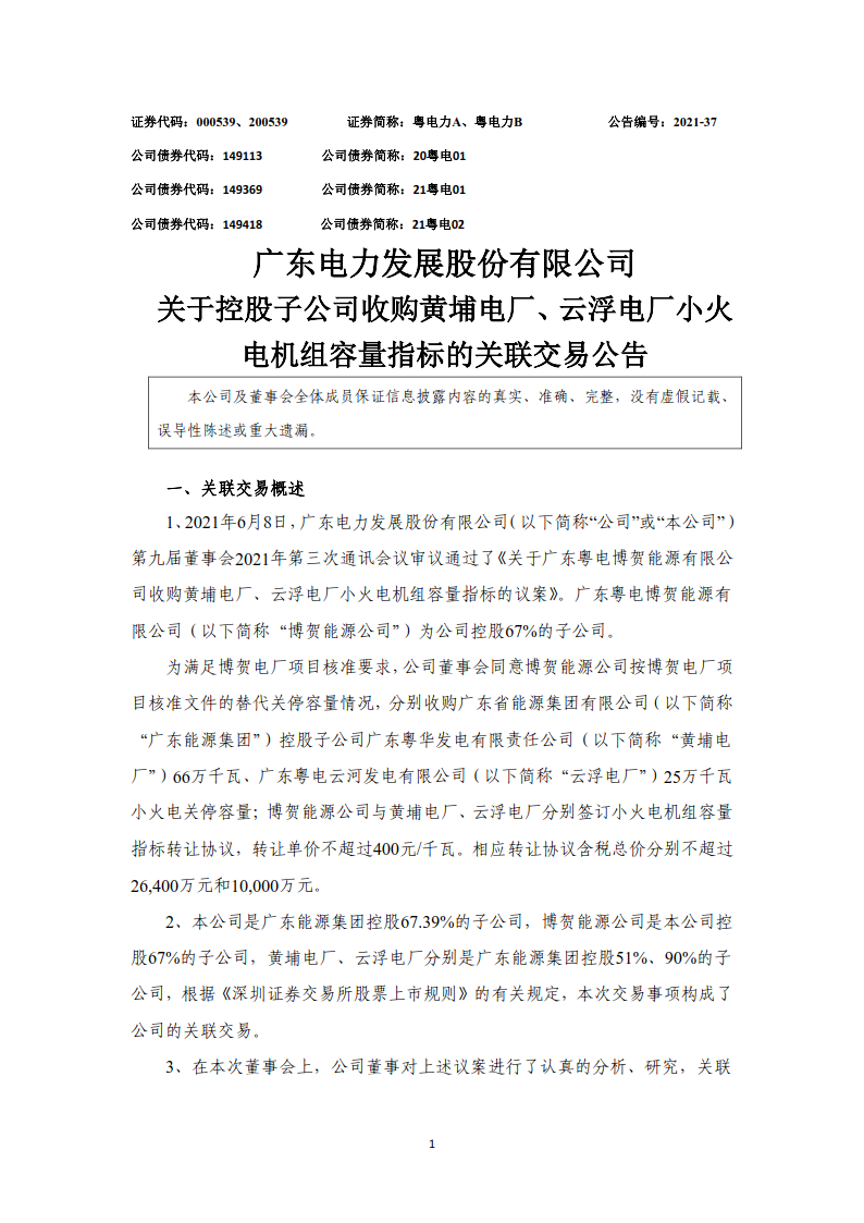 日前,粤电力A发布《广东电力发展股份有限公司关于收购黄埔电厂、云浮电厂小火电机组容量指标的关联交易公告》。