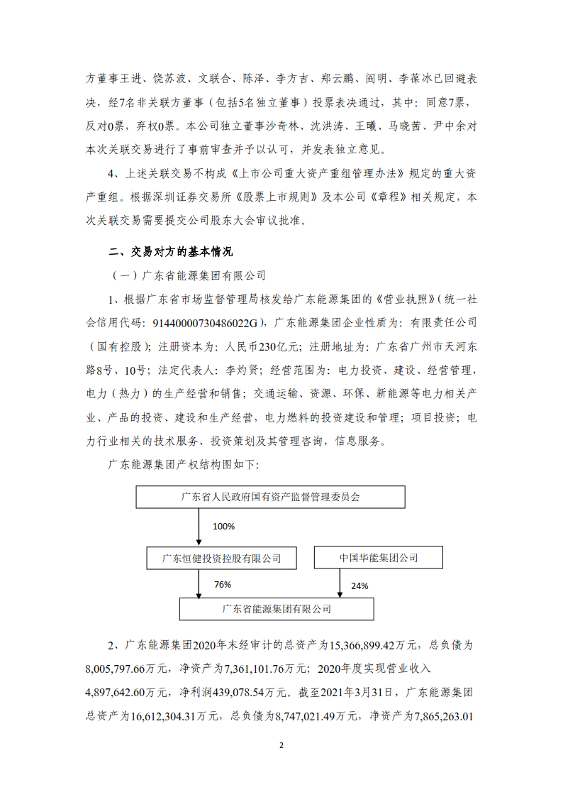 为满足博贺电厂项目核准要求,公司董事会同意博贺能源公司按博贺电厂项目核准文件的替代关停容量情况,分别收购广东省能源集团有限公司(以下简称“广东能源集团”)控股子公司广东粤华发电有限责任公司(以下简称“黄埔电厂”)66万千瓦、广东粤电云河发电有限公司(以下简称“云浮电厂”)25万千瓦小火电关停容量;博贺能源公司与黄埔电厂、云浮电厂分别签订小火电机组容量指标转让协议,转让单价不超过400元/千瓦。相应转让协议含税总价分别不超过26,400万元和10,000万元。
