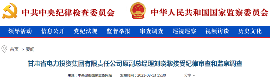 8月13日下午,中纪委网站发布消息,内蒙古电力(集团)有限责任公司原党委书记、董事长刘锦,和甘肃省电力投资集团有限责任公司原副总经理刘晓黎涉嫌严重违纪违法,目前正在接受纪律审查和监察调查。近期,甘肃已有多位领导涉嫌违纪违法被起诉并被逮捕。
