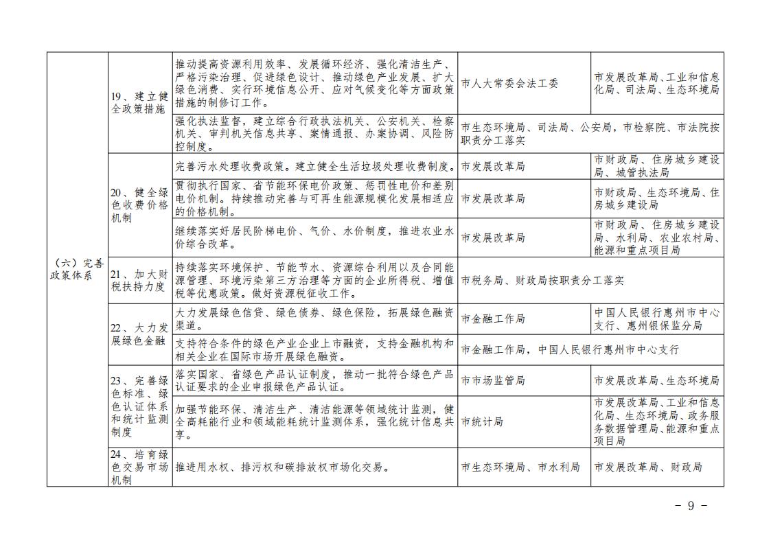 (十九)建立健全政策措施。推动提高资源利用效率、发展循环经济、强化清洁生产、严格污染治理、促进绿色设计、推动绿色产业发展、扩大绿色消费、实行环境信息公开、应对气候变化等方面政策措施的制(修)订工作。强化执法监督,建立综合行政执法机关、公安机关、检察机关、审判机关信息共享、案情通报、办案协调、风险防控制度。