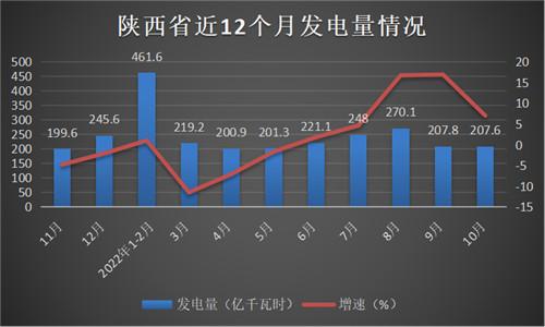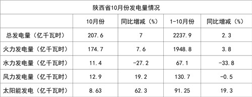 1-10月,总发电量3849.7亿千瓦时,同比增长0.5%;其中,火电发电量2950.9亿千瓦时,同比减少1.8%;水力发电量266.8亿千瓦时,同比增长16.9%;风力发电量488.3亿千瓦时,同比增长8.5%;太阳能发电量143.73亿千瓦时,同比减少2.1%。