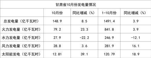 1-10月,总发电量1491.4亿千瓦时,同比增长3.9%;其中,火电发电量841.8亿千瓦时,同比增长3.9%;水力发电量246.9亿千瓦时,同比减少12.1%;风力发电量281.9亿千瓦时,同比增长16.1%;太阳能发电量120.79亿千瓦时,同比增长18.9%。