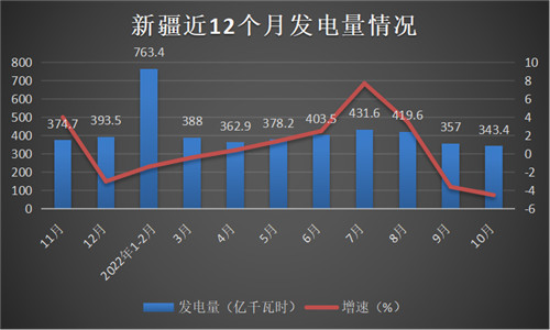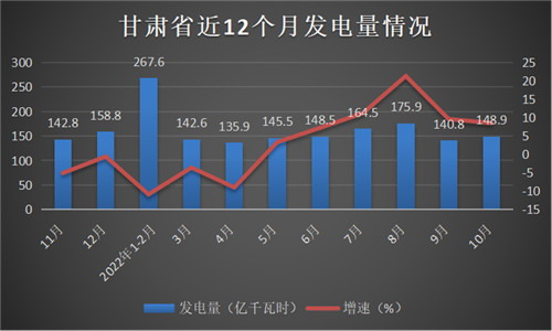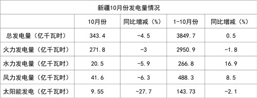 10月份,总发电量343.4亿千瓦时,同比减少4.5%;其中,火电发电量271.8亿千瓦时,同比减少3%;水力发电量20.5亿千瓦时,同比增减少5.9%;风力发电量41.6亿千瓦时,同比减少6.3%;太阳能发电量9.55亿千瓦时,同比减少27.7%。