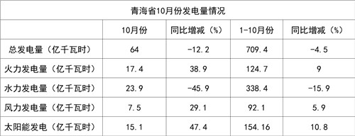 1-10月,总发电量709.4亿千瓦时,同比减少4.5%;其中,火电发电量124.7亿千瓦时,同比增长9%;水力发电量338.4亿千瓦时,同比减少15.9%;风力发电量92.1亿千瓦时,同比增长5.9%;太阳能发电量154.16亿千瓦时,同比增长10.8%。