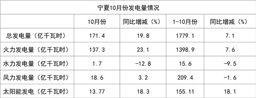 10月份,总发电量171.4亿千瓦时,同比增长19.8%;其中,火电发电量137.3亿千瓦时,同比增长23.1%;水力发电量1.7亿千瓦时,同比减少12.8%;风力发电量18.6亿千瓦时,同比增长3.2%;太阳能发电量13.77亿千瓦时,同比增长18.3%。