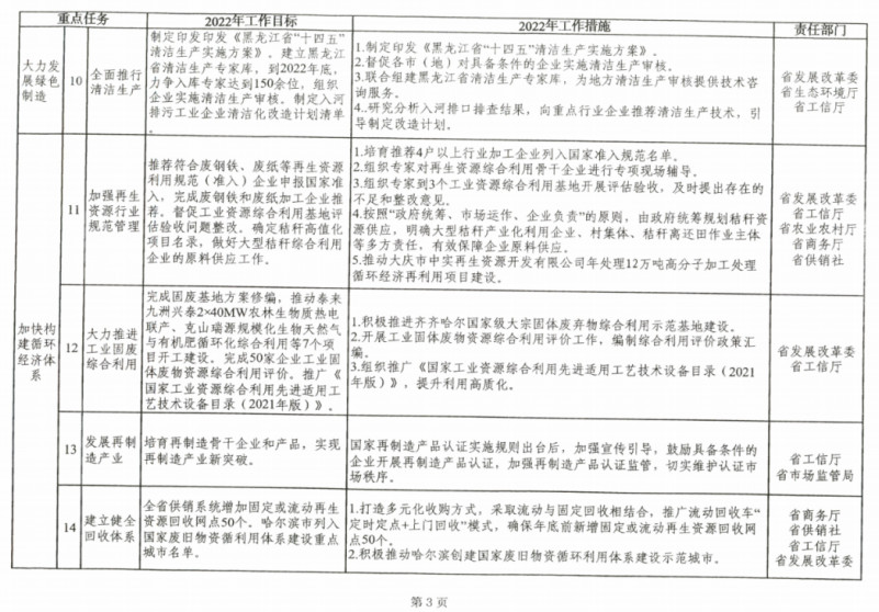资源综合利用基地建设优化。加快资源循环发展,推进齐齐哈尔、大庆、鸡西、七台河等国家级资源综合利用基地建设,支持基地内的企业开展工业资源综合利用共性关键技术装备研发应用,着力提升基地技术水平和产业服务能力。支持工业园区和重点企业开展资源循环利用改造和示范,形成典型行业可复制推广技术路线和模式。