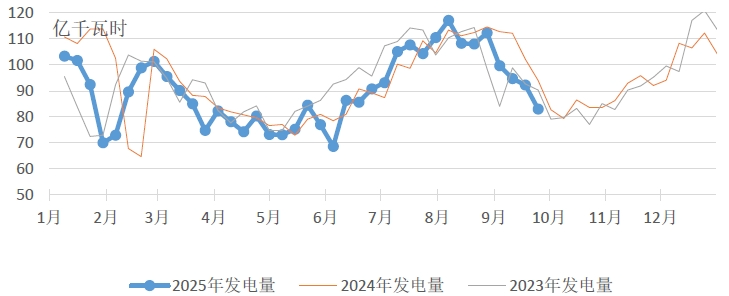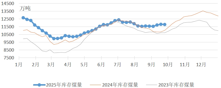 根据中电联电力行业燃料统计,截至9月25日,纳入统计的发电集团燃煤电厂本月累计发电量同比下降12.6%,本年累计发电量同比下降4.4%。燃煤电厂耗煤量本月累计同比下降13%,本年累计同比下降5.1%。燃煤电厂煤炭库存高于去年同期757万吨,库存可用天数高于上年同期4.4天。
