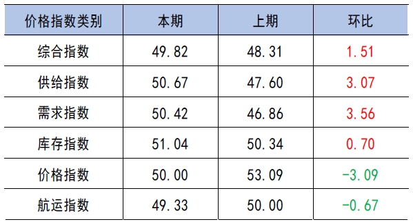 CECI沿海指数5500千卡/千克、5000千卡/千克现货成交价较上期上涨10元/吨、下跌2元/吨。从样本情况看,5500千卡/千克、5000千卡/千克规格品现货成交价样本价格区间分别为701-706元/吨、610-615元/吨。从样本热值分布看,5500千卡/千克、5000千卡/千克、4500千卡/千克样本在总量中占比分别为9.6%、58.8%、31.6%。