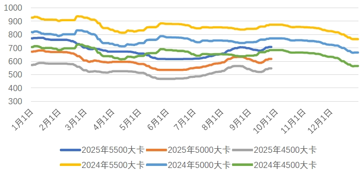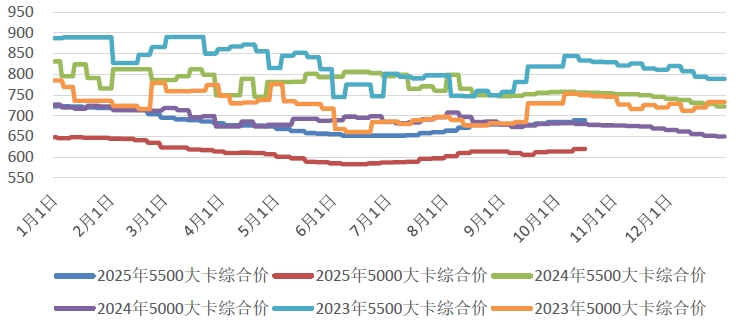 港口市场方面,本周国内港口煤炭市场呈现“供弱需强、价格上涨”格局,核心原因在于供应瓶颈与需求释放共振,叠加市场情绪的放大效应。大秦线秋季检修导致港口调入量减少,造成现货流动性趋紧,高卡煤延续结构性短缺;同时沿海电厂库存连续下降,冬储补库需求持续释放,非电行业化工需求保持韧性,共同推高现货价格。