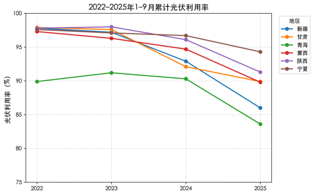2023年,西北特高压通道平均利用率约为 55%,距离设计预期的 75% 尚有提升空间,在多个时段面临较高的弃风、弃光压力。自2024年起,西北多省区装机快速攀升,叠加受端负荷时段错配等因素的影响,其风光利用率出现下滑。2025年1–9月,西北风光富集区多地的光伏利用率降至 90% 以下,风电利用率保持在90%左右,相较2022–2023年的高点出现回落,反映出系统的调节和消纳能力需要进一步加强。