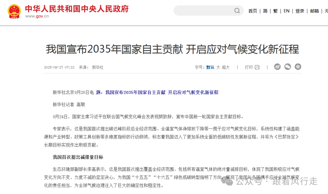 2025年9月,中国向世界宣布了2035年国家自主贡献目标,擘画出未来十年的气候治理蓝图:到2035年,“中国全经济范围温室气体净排放量比峰值下降7%-10%”,“非化石能源消费占能源消费总量的比重达到30%以上”,“风电和太阳能发电总装机容量达到2020年的6倍以上、力争达到36亿千瓦”——三项关键指标,正牵引着中国能源体系开启一场静水流深的全面变革。