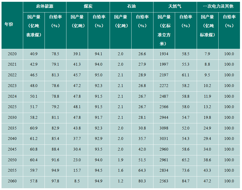 煤炭在助力非化石能源大规模高质量发展过程中将发挥重要的兜底保障作用,煤炭产量将在“十五五”期间达到峰值(48亿~49.5亿吨)后保持较长时间平台期,2035年前保持在43亿吨以上高位水平以兜住能源安全底线,到2045年降至30亿~31亿吨,2060年降至8亿~9亿吨。我国煤炭自给率始终保持在90%以上的高位水平,且不断提升,预计到2060年达到95%左右。