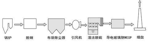 烟气先经过脱硝系统去除NOx,然后经干式电/布袋除尘器去除粉尘,之后再经过石灰石-石膏湿法脱硫装置去除SO2。脱硫塔出来后温度低、湿度大、腐蚀性强的烟气再经过导电玻璃钢WESP进行深度处理。