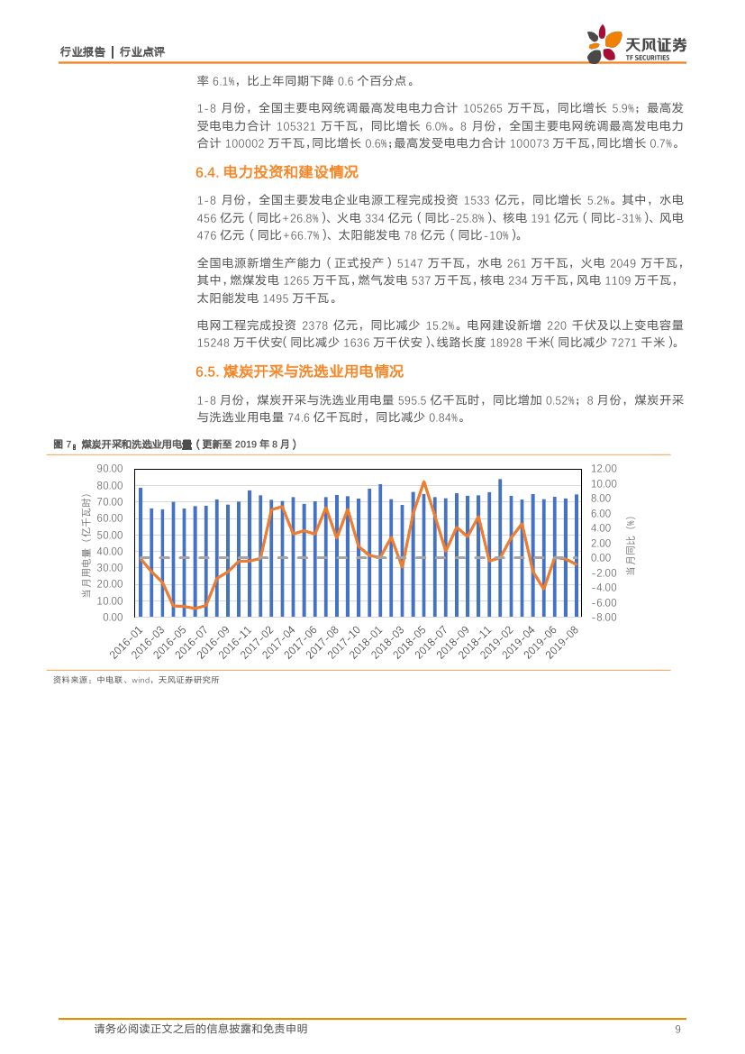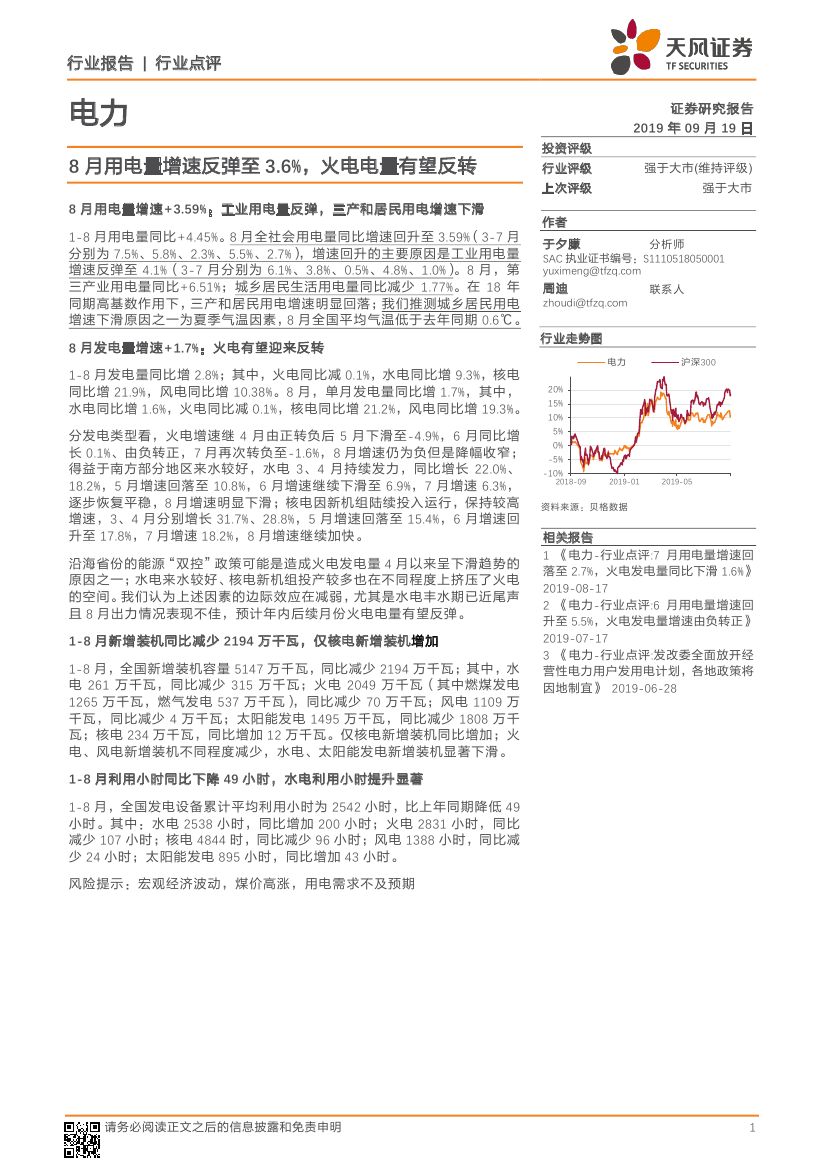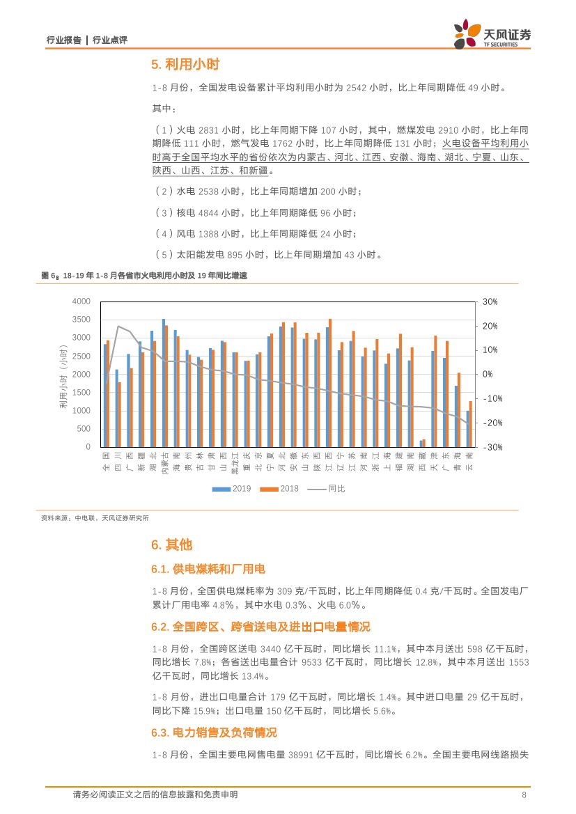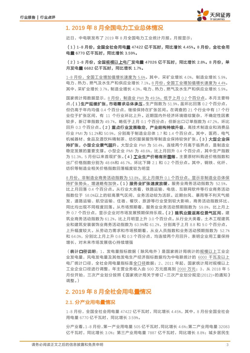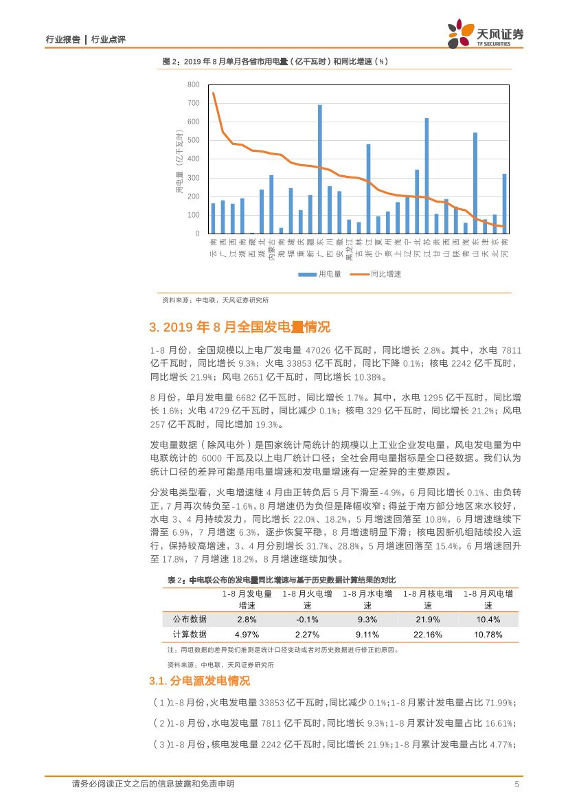 1-8 月用电量同比+4.45%。8 月全社会用电量同比增速回升至 3.59%(3-7 月分别为 7.5%、5.8%、2.3%、5.5%、2.7%),增速回升的主要原因是工业用电量增速反弹至 4.1%(3-7 月分别为 6.1%、3.8%、0.5%、4.8%、1.0%)。8 月,第三产业用电量同比+6.51%;城乡居民生活用电量同比减少 1.77%。在 18 年同期高基数作用下,三产和居民用电增速明显回落;我们推测城乡居民用电增速下滑原因之一为夏季气温因素,8 月全国平均气温低于去年同期 0.6℃。