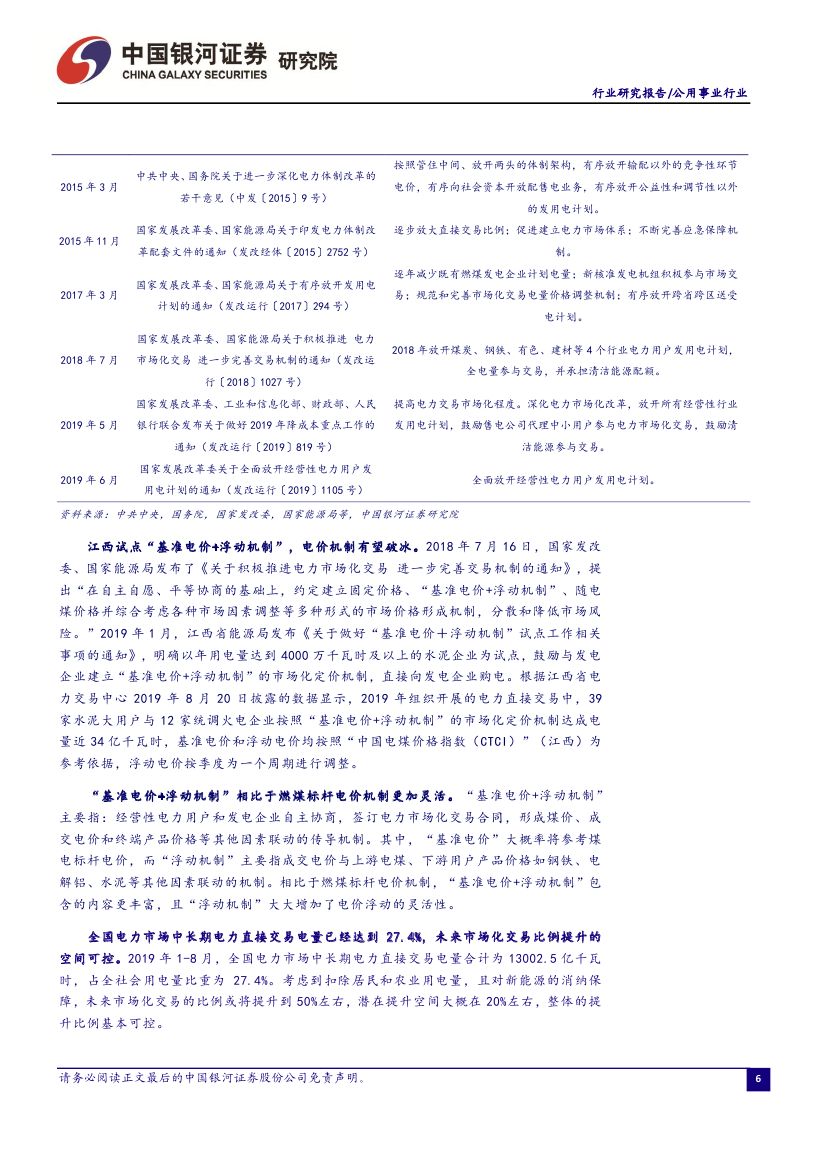 5)2019 年 1-8 月,全国电力市场中长期电力直接交易电量合计为 13002.5 亿千瓦时,占全社会用电量比重为 27.4%。考虑到扣除居民和农业用电量,且对新能源的消纳保障,未来市场化交易的比例或将提升到 50%左右,整体的提升比例基本可控。远期来看,随着电力市场化交易的 比例提升,电价机制的市场化改革推进,电力行业或回归公用事业属性。