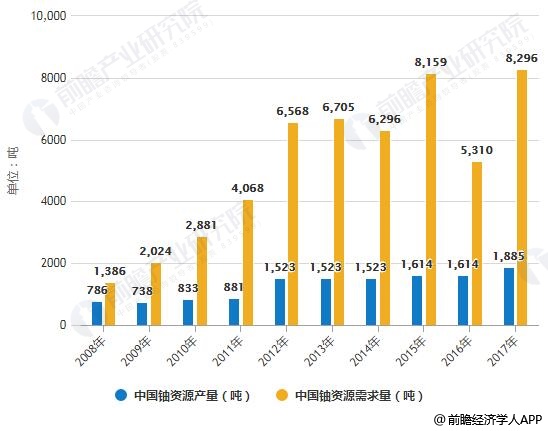 2008-2018中国铀资源产量、需求量、对外依存度高统计情况