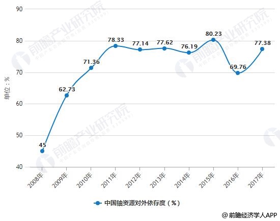 我国铀资源大部分属于非常规铀,不仅品位低、埋藏深,且开采成本昂贵,因此需要海外进口,主要国家有哈萨克斯坦、乌兹别克斯坦、加拿大、纳米比亚、尼日尔和澳大利亚。2017年我国铀资源对外依存度高达77%,并常年维持在70%以上。