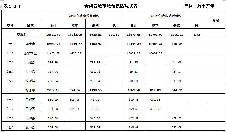 2017年底,全省城市及城镇现状采暖规模为20512万平方米,其中清洁取暖面积14076万平方米,非清洁取暖面积6436万平方米,现状清洁供暖率为68.62%。现状清洁取暖区域主要集中在西宁、海东、海西地区已通入天然气管网的市区和县城;非清洁取暖区域主要集中在海北、海南、黄南、果洛、玉树地区。