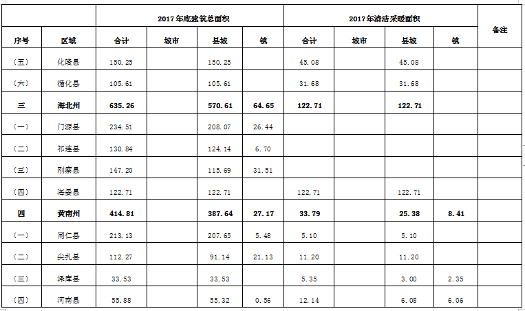 2017年末,海南州城市及城镇采暖建筑面积1035万平方米,其中清洁取暖面积348万平方米,占现状采暖面积的33.61%,非清洁取暖面积687万平方米,占现状采暖面积的66.39%。海南州共和县、贵德县已有天然气管道,采暖主要采用燃气锅炉、分户燃气壁挂锅炉等,少部分采用电锅炉采暖。同德、兴海、贵南主要采用燃煤锅炉。