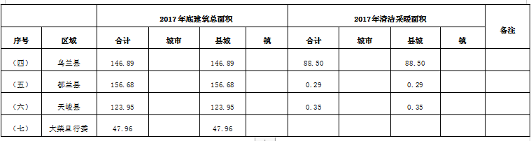 2017年末城镇采暖建筑面积6169万平方米,其中清洁取暖面积1375万平方米,占现状采暖面积的22.29%;非清洁取暖面积4794万平方米,占现状采暖面积的77.71%。