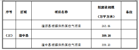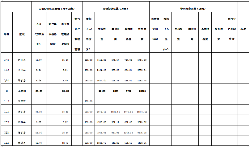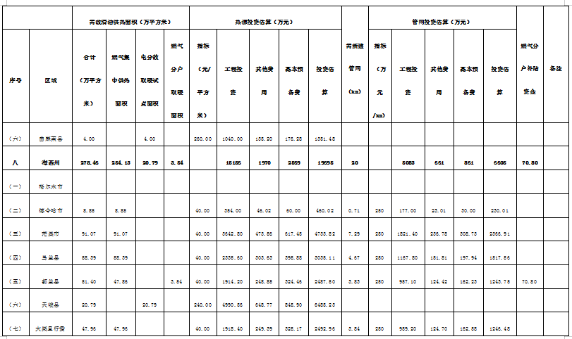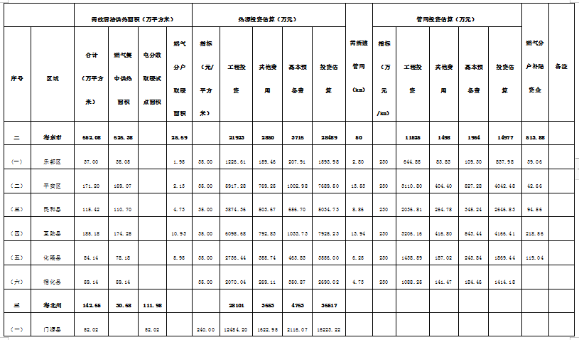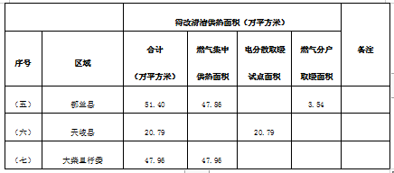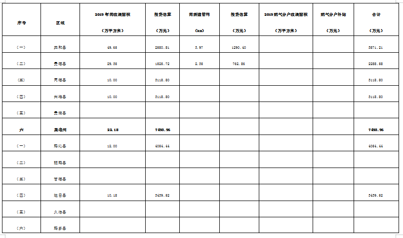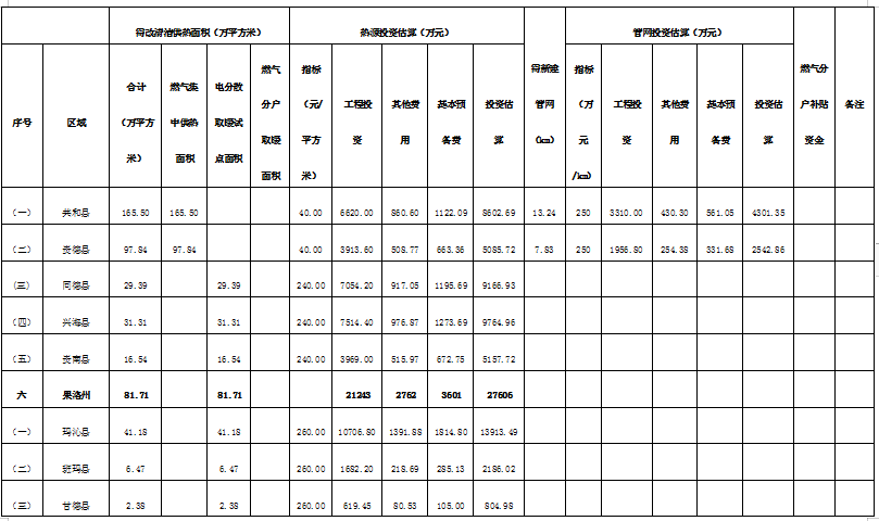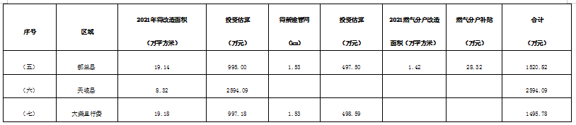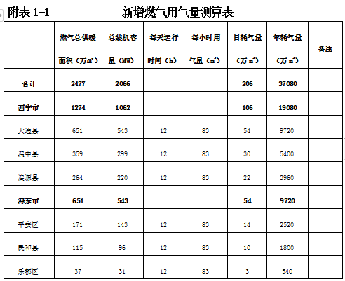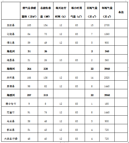 单位供暖需热量按70W/平方米,考虑10%热损耗,每兆瓦锅炉容量可供采暖面积12857平方米,为便于计算,本方案按每兆瓦锅炉容量可供采暖面积12000平方米计,估算所需取暖规模的装机容量为2066兆瓦,锅炉运行时间按每天12小时,每兆瓦每小时用气量为83立方米,计算得出各地区日用气量,再根据各地区的采暖天数计算各地区的年供气量。测算出本次清洁取暖改造完成后,将增加年用气量约37080万标准立方米。具体分地区能源需求详见下表: