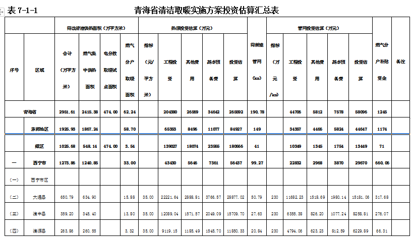 估算投资为32.49亿元。按采暖方式分:燃气集中热源投资11.34亿元,管网投资5.81亿元,电分散投资15.22亿元,燃气分户补贴0.12亿元。按地区分:西宁、海东投资为13.07亿元,藏区六州投资为19.42亿元。拟通过政府资金投入,引导社会资本通过政府和社会资本合作(PPP)模式、银行业金融机构对清洁取暖项目给予信贷支持、企业及居民自筹(分户采暖)解决。